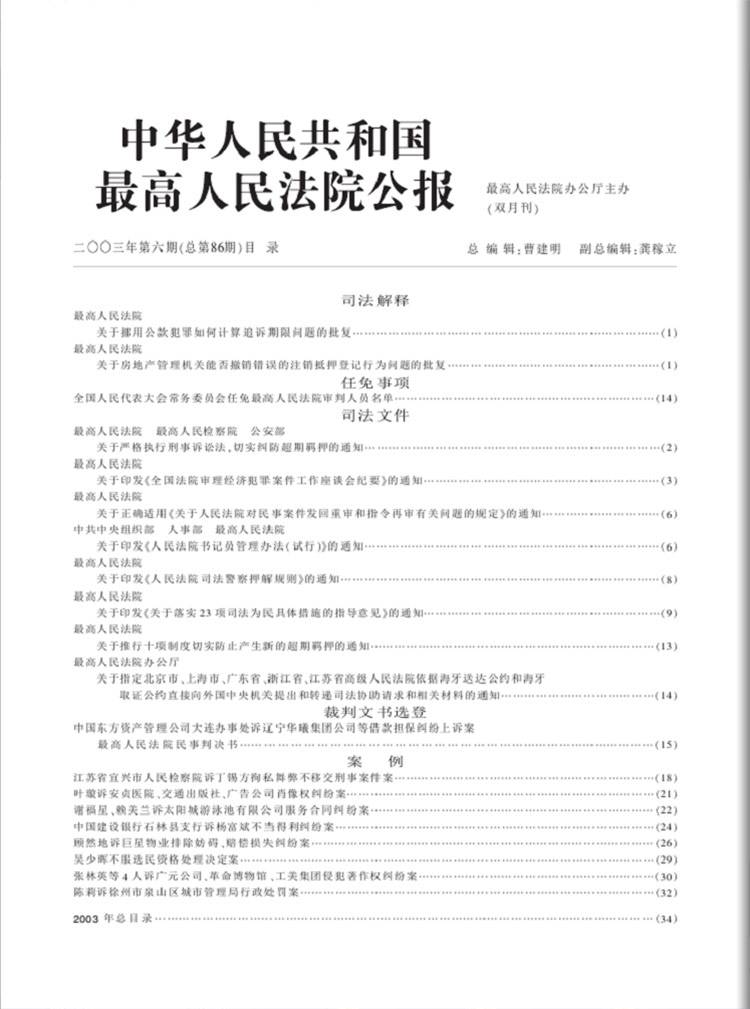 将《最高人民法院公报》2008年全年公布的资料和文献内容重新进行了整理和归类,以便于读者能够按《最高人民法院公报》公布的年度、资料的文档类别和法律类别进行查阅。